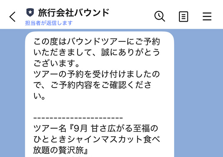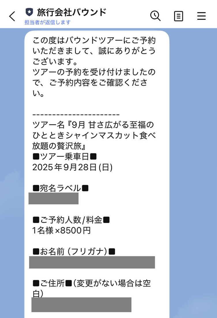 ご旅行案内の送付…催行確定後、郵送もしくはメール、LINEメッセージにてお送りいたします。(遅くとも旅行実施日の10日前)。なお、ご希望に添えられない場合も通知を送らせていただいています。